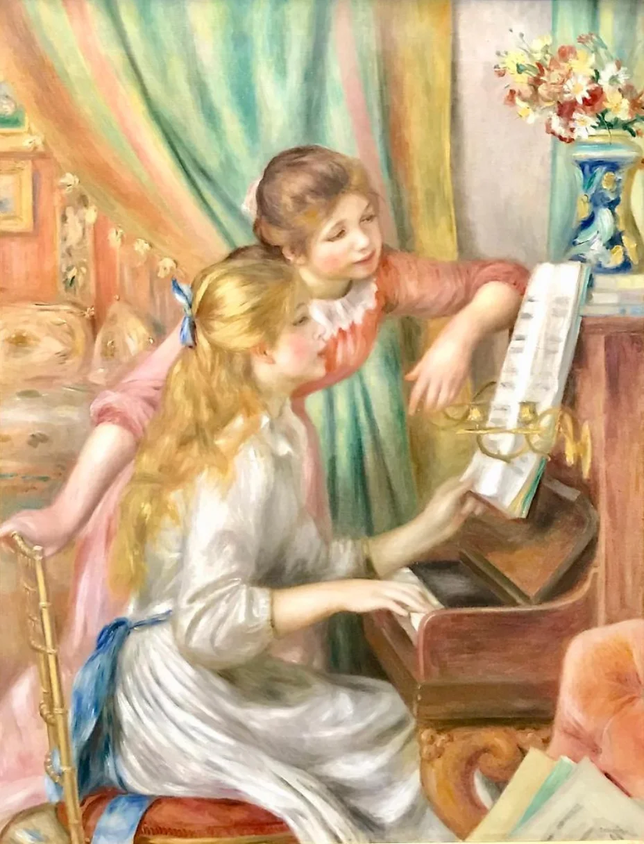 조용한 오후, 두 소녀가 나란히 앉아 피아노 건반을 두드리고 있습니다. 르누아르의 부드러운 색감과 소녀들의 따뜻한 모습이 어우러져, 보는 것만으로도 미소가 지어집니다. 피아노 위에 올려진 악보, 뒤에 살짝 드리워진 커튼, 그리고 공간을 채우는 은은한 색채가 옥실옥실한 실내 분위기를 만들어냅니다.