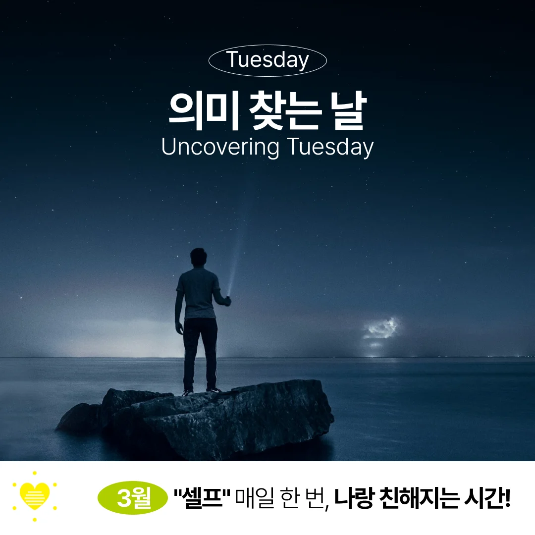 화요일은 ‘의미를 찾는 날’이에요. 반복되는 일상을 지내다보면 ‘난 지금 여기서 뭐하는 거지?’하고 삶의 의미를 잃을 때가 있어요. 이런 상태가 계속되면 무기력해지거나 우울해질 수 있어요. 심하면 번아웃에 빠지기도 하죠. 이를 이겨내는 좋은 방법이 작은 변화를 통해 삶의 의미를 발견하는 거예요. 일상에서 ‘의미’라는 반짝반짝한 보물을 찾아보세요. 당신의 삶에 활력을 불어넣어 줄 거예요.