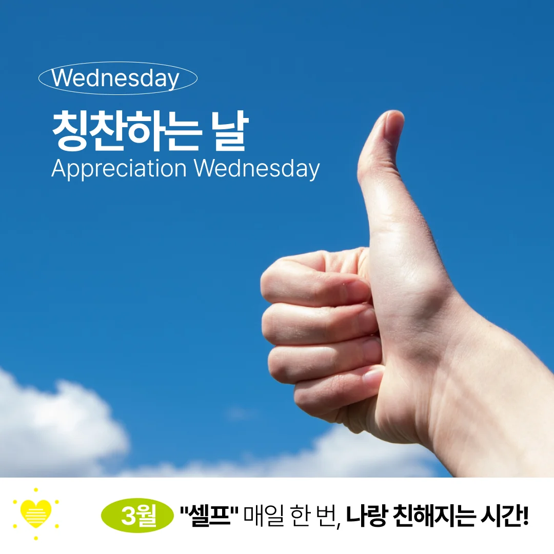 수요일은 ‘나를 칭찬하는 날’이에요. 당신은 스스로의 어떤 점을 좋아하시나요? 스스로에게 칭찬해본 적이 있나요? 우리는 다른 사람을 칭찬하거나 인정하는 일은 비교적 자주하지만, 정작 자신의 장점과 노력에 대해서는 쉽게 지나쳐 버리곤 해요. 그러나 스스로를 격려하고 칭찬하는 행동은 지친 마음을 위로하고 앞으로 나아갈 힘을 주는 중요한 행동이에요. 화요일은 자신의 장점을 찾아 스스로에게 진심어린 격려와 칭찬의 한마디를 건네보는 건 어떨까요?