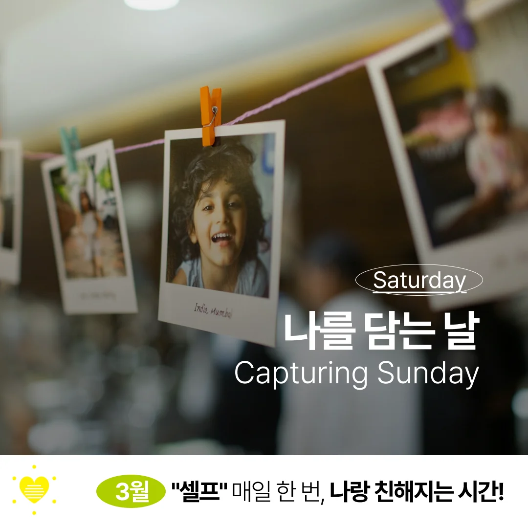 일요일은 재밌는 방식으로 나를 사랑해보려고 해요. 바로 "나를 담는 날"입니다. 휴대폰 갤러리를 열어보세요. 어떤 사진들이 저장되어 있나요? 맛있는 음식, 운동 후 땀흘린 나의 모습, 여행지의 풍경들, 셀카 등 기억하고 싶은 순간들을 남기곤 하죠. 그런데 ‘나’를 담는 방법은 사진에만 국한되지 않아요. 나의 생각을 기록한 일기, 감정을 표현한 그림, 내 이야기 같은 음악도 기록의 훌륭한 방법중 하나예요. 주말에는 나를 기록하는 시간을 가져봅니다. 분명 자신을 깊이 이해하고 기억하는 소중한 시간이 될거예요.